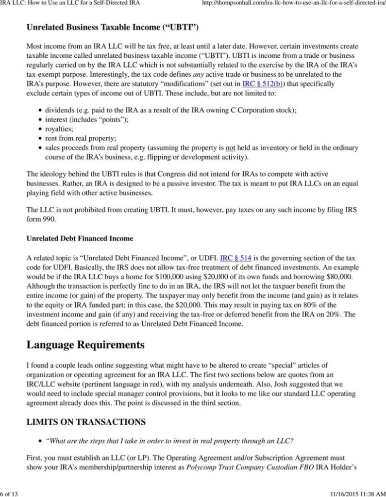3 3 of 13 11/16/ :38 AM The IRA [custodian] reserves the right to impose additional investment restrictions. For example, because of administrative burdens, many IRA trustees do not allow IRA owners to invest IRA funds in real estate. IRA law does not prohibit investment in real estate, but trustees are not required to offer real estate as an option. This benefit comes with a risk. Because owners can now invest on their own with little or no supervision, they are less likely to make a prohibited transaction and lose the IRA’s tax exemption. Investors should be prudent and should consult an attorney or CPA before making a transaction if there is any uncertainty as to whether it is prohibited. The last benefit is limited liability. Let’s say your IRA invests half of its money in an LLC and half in mutual funds. If some type of liability arises in connection with an investment in an LLC, only the money invested in the LLC is at risk to keep the mutual funds safe. If the same investment were made by an IRA directly without the LLC shield, the entire IRA would be available to pay the liabilities. The use of IRA LLCs to control retirement funds appears to be a growing trend in the financial community, and therefore the preparation of special control agreements is a growing trend among law firms. Prices can range from $5,000 to $10,000, and even cheaper companies charge around $1,000. Legal Issues There are three main issues that arise regarding IRA LLCs. First, the LLC must avoid prohibited transactions of certain types of transactions with related parties. This is the most serious issue, as engaging in prohibited transactions results in the withdrawal of the entire IRA, leaving you with a significant tax liability. However, there are some exceptions. Second, the LLC must avoid certain actions such as using an IRA as security for a loan or investing in life insurance or statutory collections. Violation of these rules only results in an income tax liability for the amount used. Third, LLCs must avoid generating unrelated business taxable income (UBTI). If such income is generated, it is double taxed, the IRA will have to pay tax on it immediately, and you will have to pay tax on it when the IRA is later paid out. Ideally, control agreement language can protect against these issues. It should be noted, however, that some legal websites do not believe that special language is necessary to avoid tax obligations and penalties. As long as the individual transactions do not violate the prohibited transaction rule, the IRA LLC will retain its tax benefits. However, they recommend including special language to make things better in the event of an IRS audit. Prohibited Transactions Prohibited transactions are governed by IRC 408(e)(2), which prohibits most transactions between IRAs (here, LLCs) and disqualified persons. Prohibited transactions and disqualified persons are defined in 4975(c)(1) and 4975(e)(2): 1. General rule: For purposes of this section, the term prohibited transaction means any direct or indirect sale or exchange, or lease. , of any assets between the plan and the disqualified person;