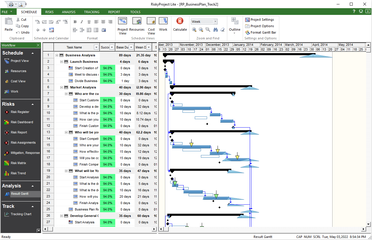 Gantt Chart Template with Built-in Risk Tracking A Gantt chart template with built-in risk tracking is a powerful project management tool that combines the visual timeline of a traditional Gantt chart with a dedicated system for identifying, assessing, and managing project risks. This integrated approach provides a comprehensive view of the project, allowing project managers and teams to proactively mitigate potential issues and keep the project on schedule and within budget. **Understanding the Components** Before diving into the specifics of a risk-aware Gantt chart template, it’s important to understand its two core components: * **Gantt Chart:** A Gantt chart is a horizontal bar chart that visually represents a project schedule. Each bar represents a task or activity, with its length indicating the duration. The chart typically displays: * Task names or descriptions * Start and end dates for each task * Task dependencies (which tasks must be completed before others can begin) * Milestones (significant points or deliverables within the project) * The critical path (the sequence of tasks that directly impacts the project’s overall completion date) * Resource assignments (who is responsible for each task) * **Risk Tracking System:** This element involves a structured approach to risk management, usually implemented within the template using dedicated columns or sections. Key elements of a risk tracking system include: * **Risk Identification:** The process of identifying potential threats and opportunities that could impact the project. * **Risk Assessment:** Evaluating the likelihood and impact of each identified risk. This often involves assigning numerical scores or qualitative categories (e.g., high, medium, low) to both likelihood and impact. * **Risk Prioritization:** Ranking risks based on their overall severity (often calculated as likelihood multiplied by impact). This helps focus efforts on the most critical risks. * **Risk Response Planning:** Developing strategies to mitigate threats and capitalize on opportunities. Common risk response strategies include: * **Avoidance:** Eliminating the risk altogether (e.g., changing the project scope). * **Transference:** Shifting the risk to a third party (e.g., purchasing insurance). * **Mitigation:** Reducing the likelihood or impact of the risk (e.g., implementing backup plans). * **Acceptance:** Acknowledging the risk and taking no action (usually for low-priority risks). * **Risk Monitoring and Control:** Continuously tracking identified risks, monitoring their status, and implementing risk response plans as needed. **Features of a Risk-Aware Gantt Chart Template** A well-designed Gantt chart template with built-in risk tracking should include the following features: * **Task Management:** Core Gantt chart functionalities for defining tasks, setting durations, establishing dependencies, and assigning resources. * **Risk Register:** A dedicated section or table for documenting identified risks. This should include columns for: * **Risk ID:** A unique identifier for each risk. * **Risk Description:** A clear and concise description of the risk. * **Risk Category:** Grouping risks into categories (e.g., technical, financial, schedule, resource). * **Likelihood:** A measure of the probability that the risk will occur. * **Impact:** A measure of the potential consequences if the risk occurs. * **Severity/Priority:** A calculated score or rating based on likelihood and impact. * **Risk Response Strategy:** The chosen approach for managing the risk. * **Risk Owner:** The individual responsible for monitoring and managing the risk. * **Contingency Plan:** A detailed plan of action to be implemented if the risk occurs. * **Status:** The current status of the risk (e.g., open, in progress, resolved, closed). * **Visual Risk Indicators:** The ability to visually represent risk information directly on the Gantt chart. This could involve: * **Color-coding tasks:** Using colors to indicate the risk level associated with a task (e.g., red for high risk, yellow for medium risk, green for low risk). * **Risk icons:** Adding icons to the Gantt chart to flag tasks with identified risks. * **Risk impact indicators:** Displaying the potential impact of a risk on the task duration or completion date. * **Dependency Integration:** The template should allow you to link risks to specific tasks or dependencies, enabling you to understand how risks could affect the project schedule. For instance, if a critical task depends on a piece of equipment that is at risk of failing, the template should visually highlight the potential schedule impact. * **Reporting and Analytics:** The ability to generate reports on risk status, trends, and mitigation efforts. This allows project managers to track progress, identify areas of concern, and communicate risk information to stakeholders. Reports might include: * Risk summaries by category * Top risks by severity * Risk response plan status * Trends in risk likelihood and impact * **Customization:** The template should be customizable to fit the specific needs of the project. This might involve adding custom fields, modifying risk categories, or adjusting the severity scoring system. **Benefits of Using a Risk-Aware Gantt Chart Template** * **Proactive Risk Management:** Encourages early identification and assessment of risks, allowing for proactive mitigation efforts. * **Improved Decision-Making:** Provides a clear and concise overview of project risks, enabling informed decision-making. * **Enhanced Communication:** Facilitates communication about risks to stakeholders, promoting transparency and collaboration. * **Reduced Project Delays:** By anticipating and mitigating risks, the template helps to minimize project delays and cost overruns. * **Better Resource Allocation:** Prioritizing risks allows for better allocation of resources to address the most critical threats. * **Comprehensive Project View:** Integrates
