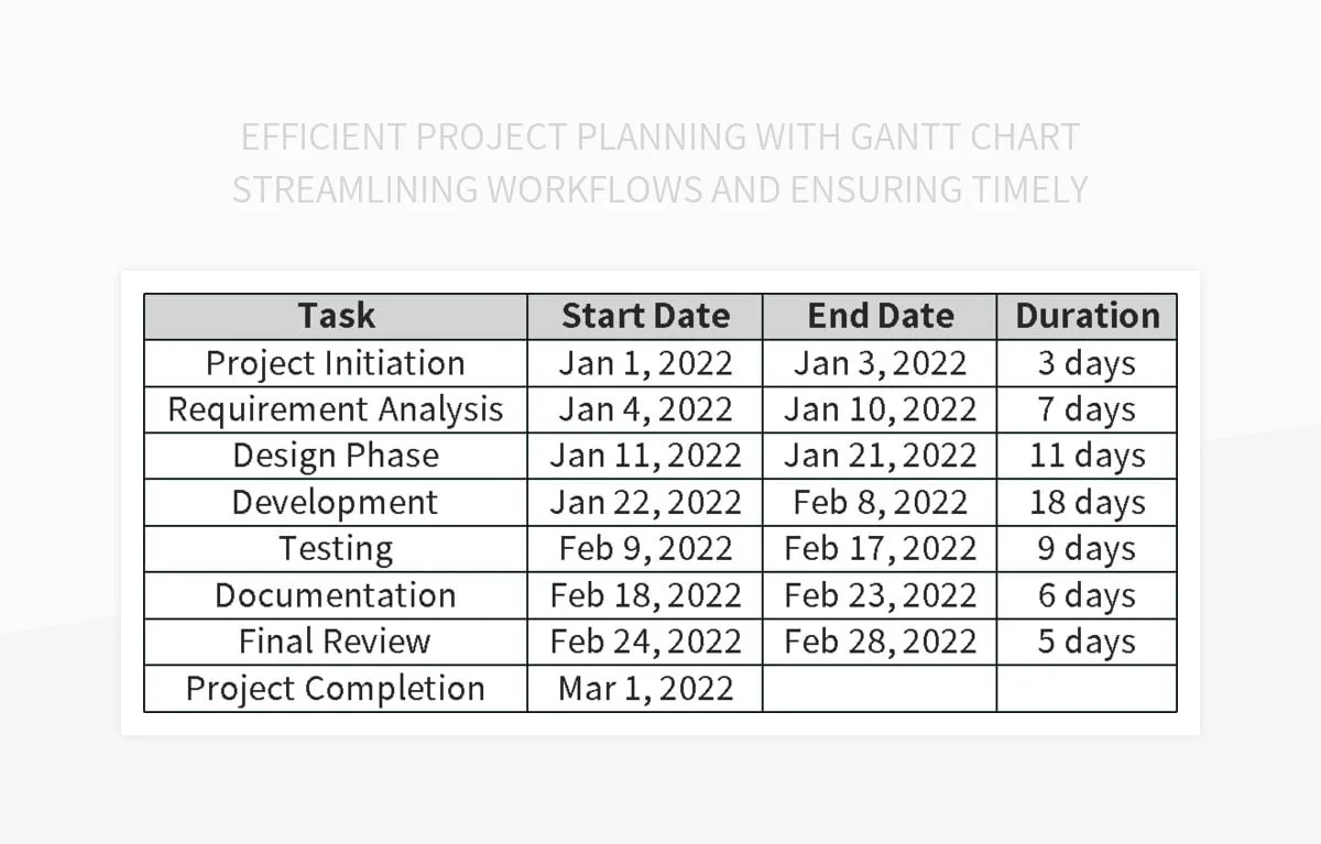 - Duration: The estimated amount of time required to complete each task. This can be expressed in days, weeks, or months.