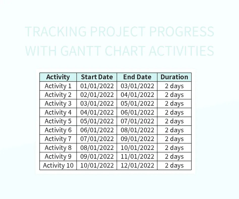 - Start and End Dates: The planned start and end dates for each task. These dates determine the duration of the task and its position on the Gantt chart.
