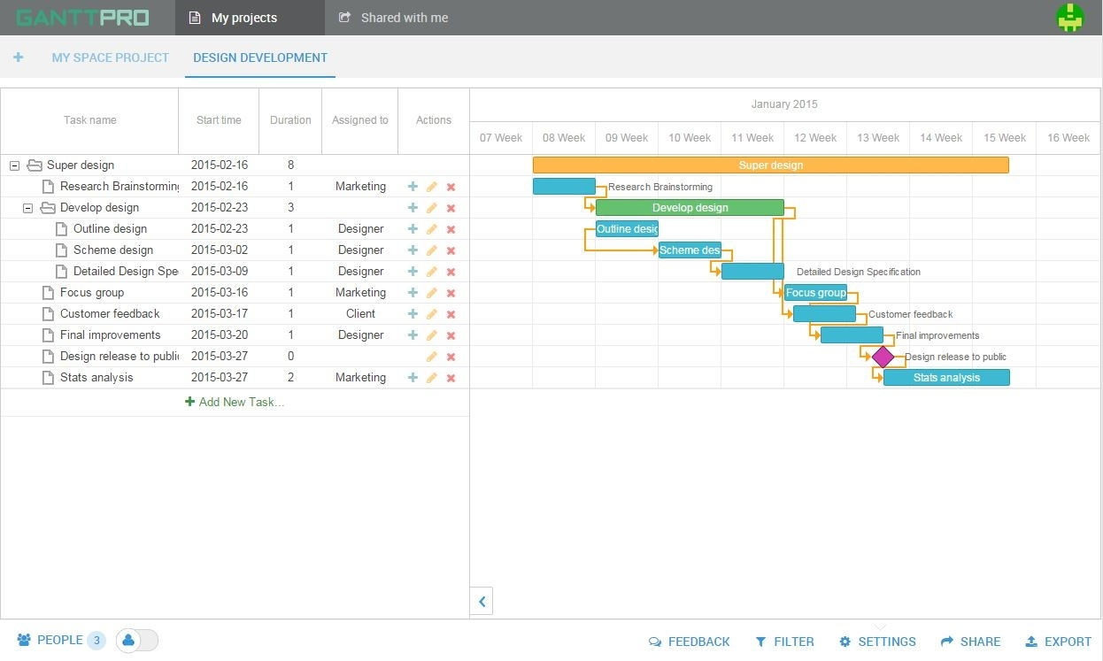 - Drag-and-Drop Functionality: Allows users to drag and drop tasks to adjust their start and end dates.